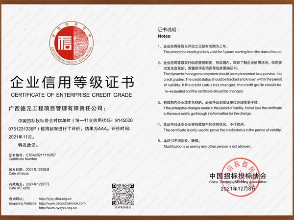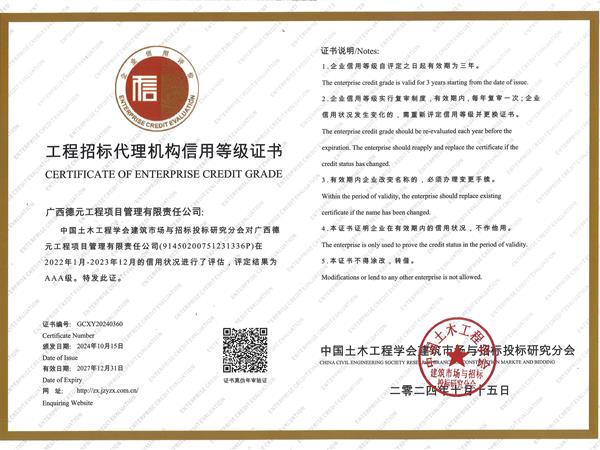 工程招標(biāo)代理機(jī)構(gòu)AAA企業(yè)信用等級證書