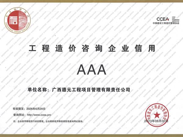 工程造價咨詢企業(yè)AAA企業(yè)信用等級證書