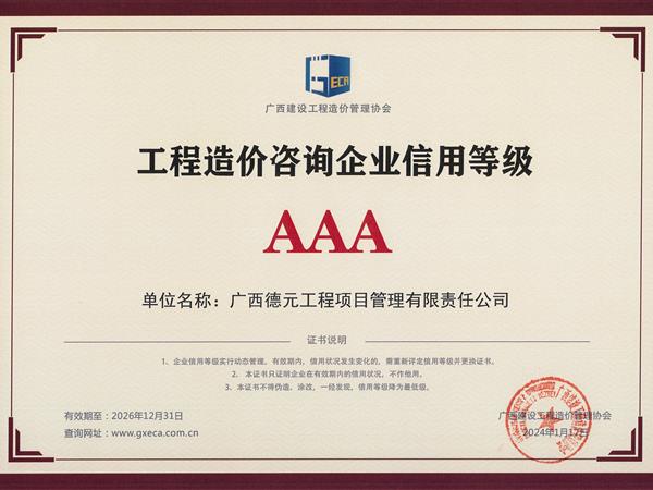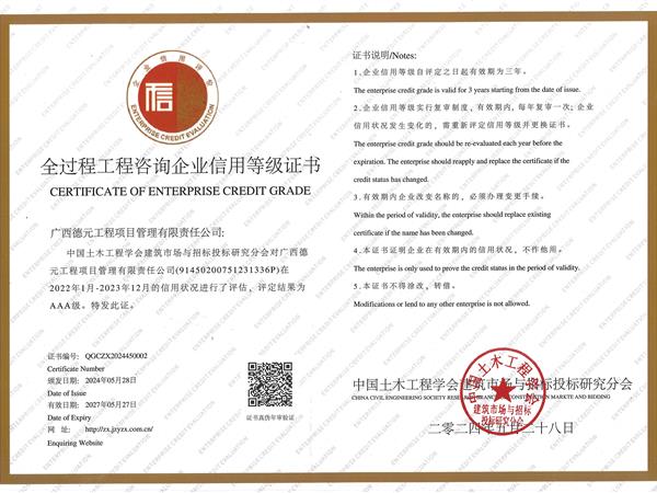 全過程工程咨詢企業(yè)AAA企業(yè)信用等級證書