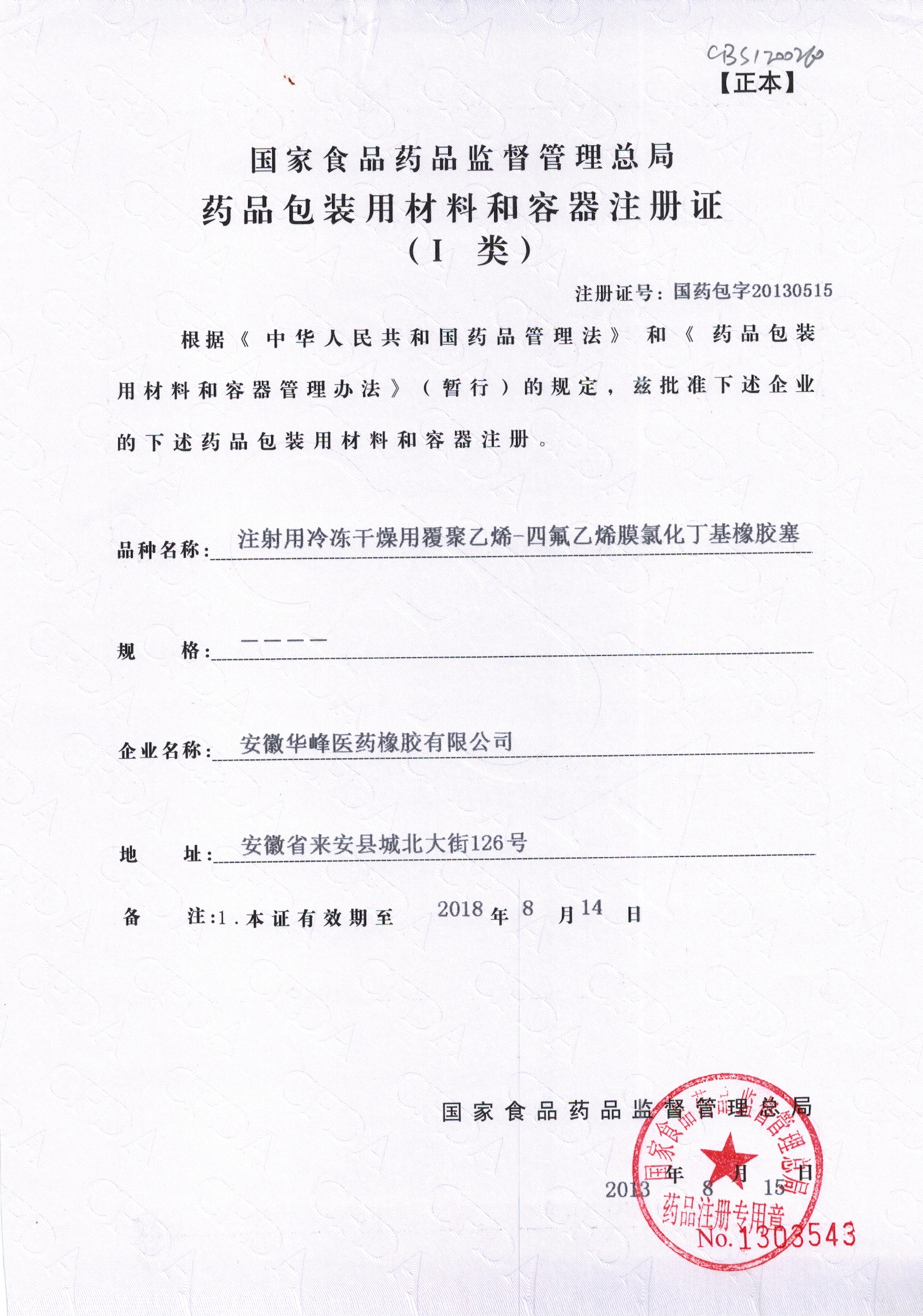Registration Certificate for PTFE Film Laminated Butyl Rubber Stopper for Freeze-drying for Injection(Chloride)