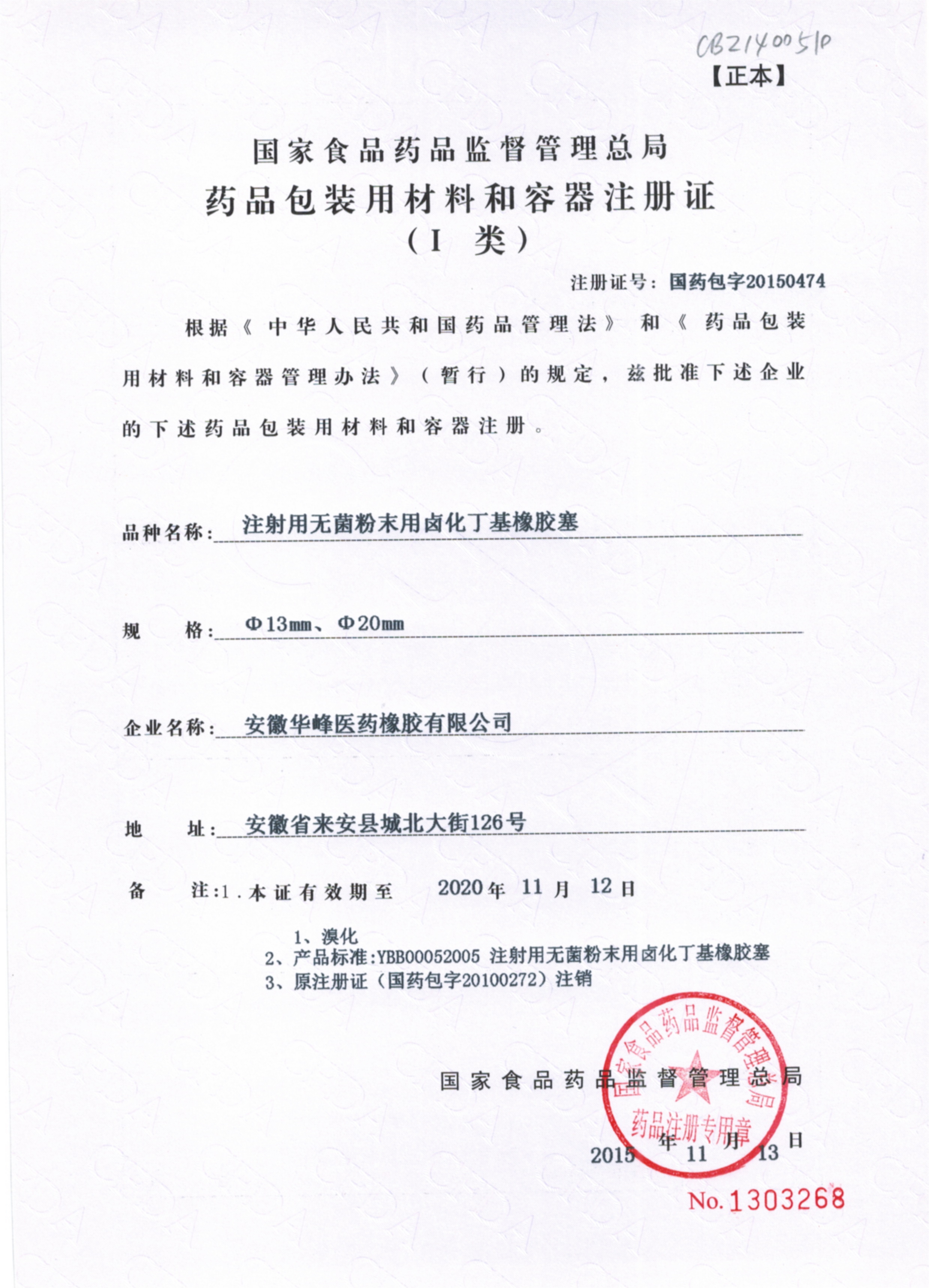 Registration Certificate for Halogenated Butyl Rubber Stopper for Sterile Powder for Injection (Brominated)